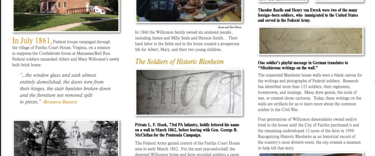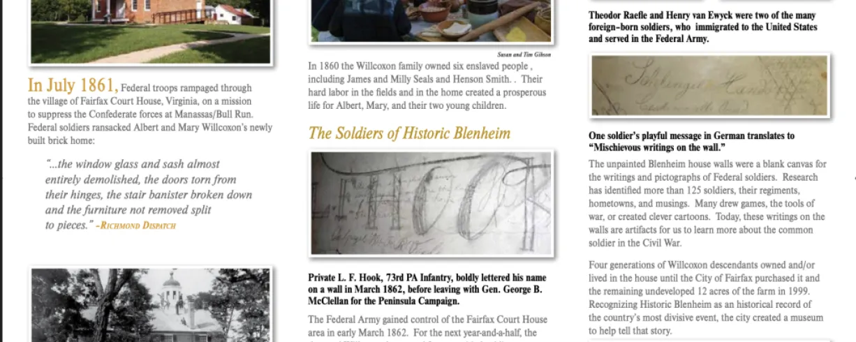 Exhibits, and the daily guided tour of the Historic Blenheim house, focus on the impact of war in the area, the family, and enslaved residents of Blenheim, and the Union soldiers that left their mark as they traveled through Fairfax Courthouse. Multimedia in our large viewing room shows specific features of the house’s walls.
