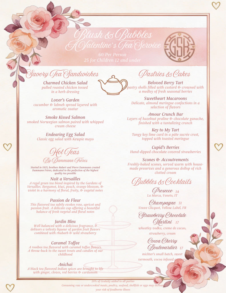 Steeped in romance and wrapped in rosy hues, our Valentine’s Day Afternoon Tea is the perfect way to linger over love. Indulge in tiered trays of delicate savories, heart‑touched pastries, and freshly baked scones, all paired with premium teas and a complimentary glass of sparkling wine to toast your favorite person. Whether it’s a first date, forever love, or a celebration with your closest friends, this charming tea service promises an intimate pause from the everyday and a sweet memory to savor long after the last sip. $60 per adult, $30 per child under 12. For large groups, contact Restaurant.managers@TheDarcyHotel.com for a tailored experience. To book: OpenTable - Choose a time for your experience