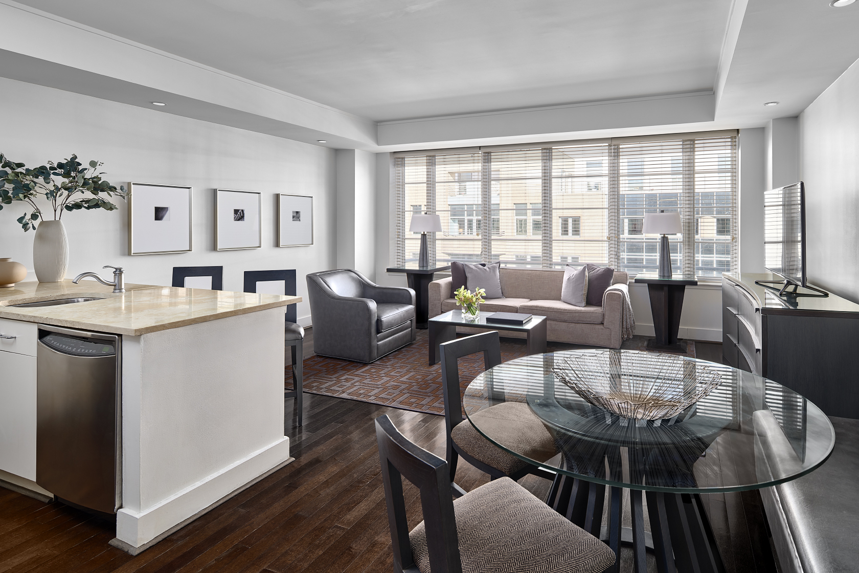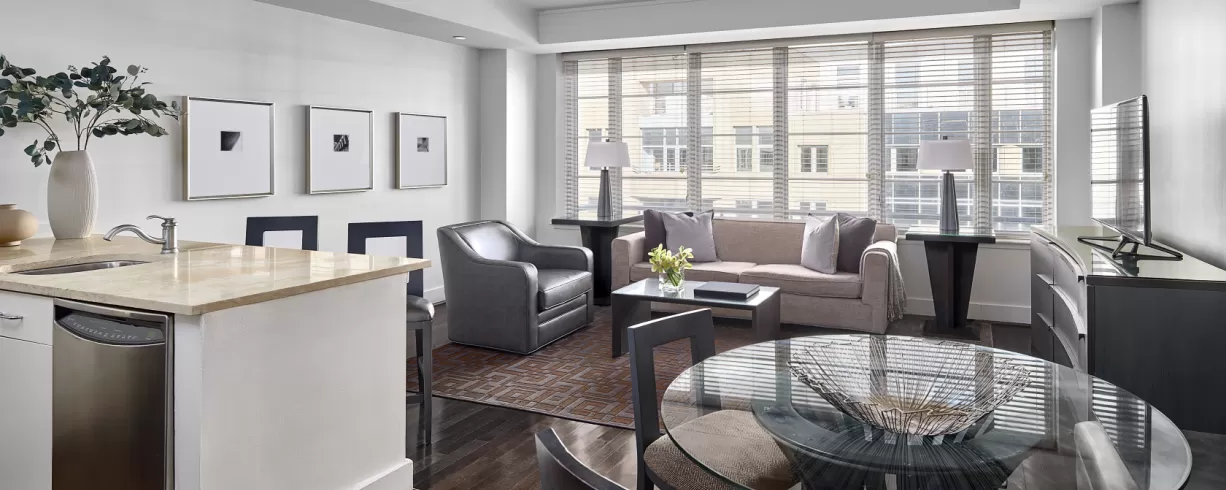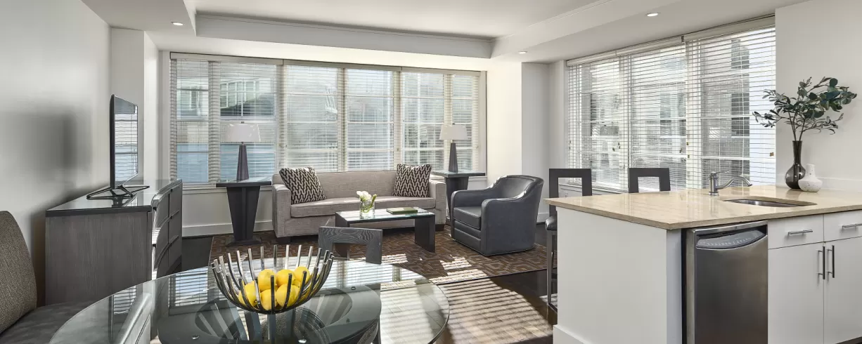 AKA White House is a hotel residence located at 1710 H Street just 2 blocks from the White House, a stone's throw from the National Mall and a short taxi or Metro ride away from the Convention Center. AKA White House offers nightly, weekly and monthly rates for our spacious and contemporary furnished One Bedroom (700 square feet) and Two bedroom (1,100 square feet), four suites with fully equipped kitchens, separate living rooms and in-suite washer and dryer. We also have spectacular Penthouse Terrace Suites. Complimentary in-suite services include high-speed wireless internet, Direct TV and local phone calls.