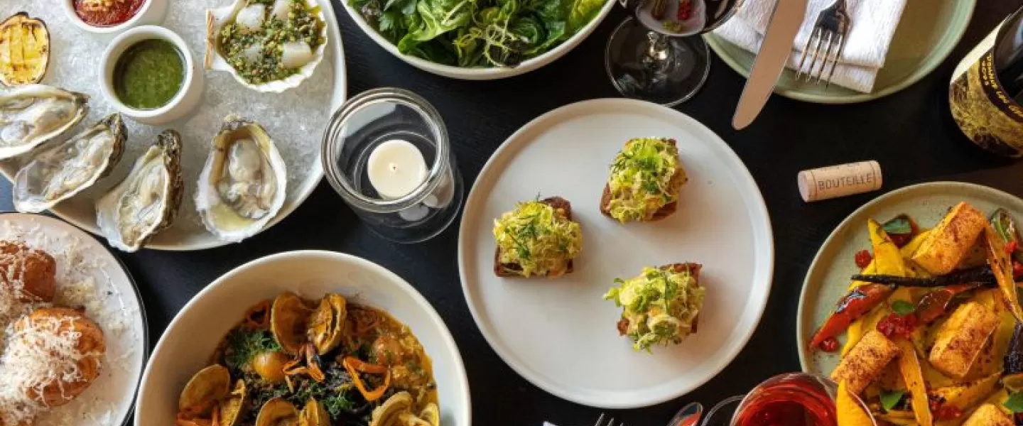 Dine at a.kitchen+bar, by James Beard Award winner Ellen Yin, featuring hyper-seasonal American small plates and an acclaimed natural wine program.
