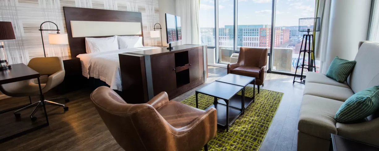 For a prime location to see the nation's capital, reserve a room or suite at our hotel. We are located adjacent to the Nationals Ballpark in the heart of delicious new restaurants. We offer quick access to the DC Metro rail system, so you can visit the most popular attractions and explore the city with ease. Many rooms offer views of the Capitol Riverfront and into the stadium for a unique experience. Our hotel near Capitol Hill is the perfect choice for your visit.