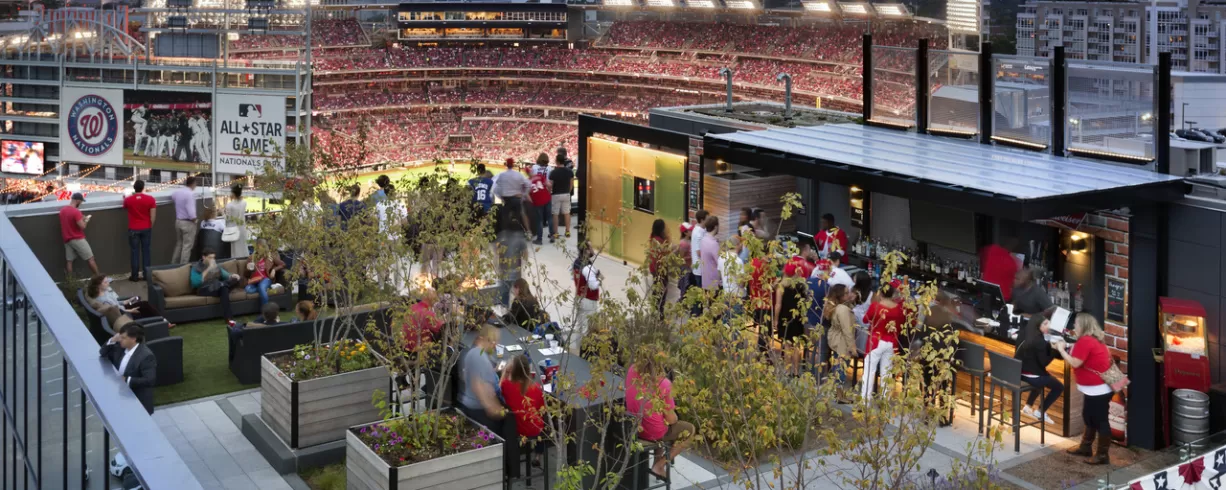 People in Washington DC, love their rooftop bars and lounges and just one visit to Top of the Yard, our rooftop bar and unique outdoor event venue, and you can see why. Enjoy monumental views of downtown Washington DC, including exclusive views directly into Nationals Park, as well as views of the Capitol Riverfront, multiple monuments and more. Top of the Yard is open seasonally with special hours for baseball home games and specials events at Nationals Park.