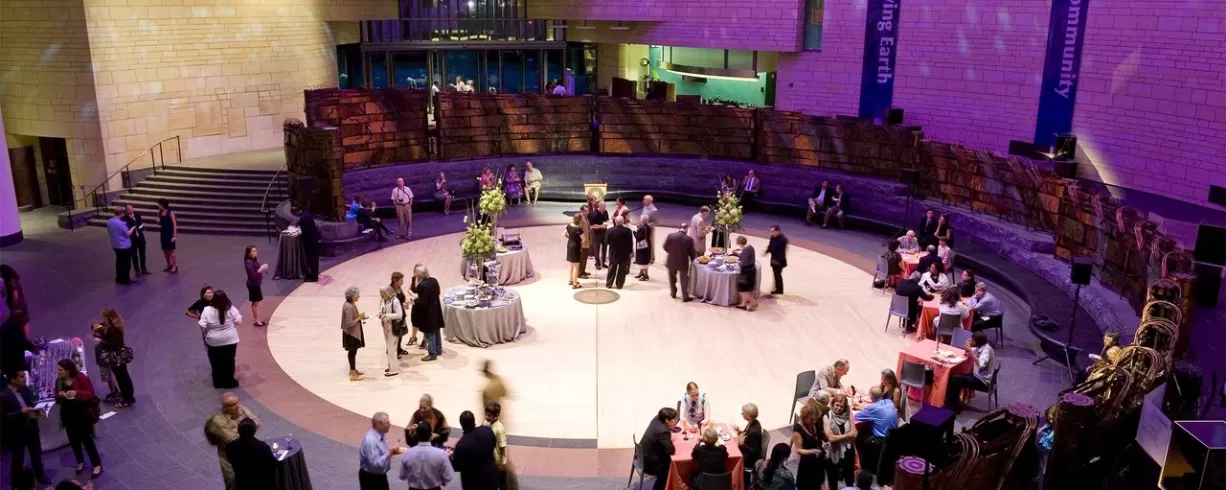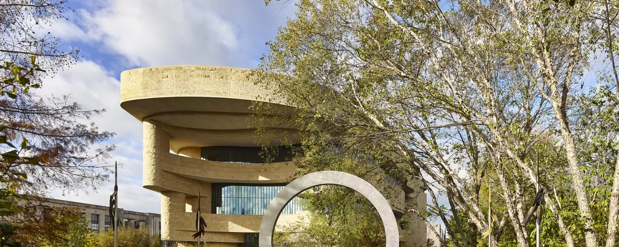 Situated near the U.S. Capitol, the National Museum of the American Indian is a striking presence on the National Mall. The building's curvilinear form evokes a wind-swept mesa. Additional features such as the museum's east-facing entrance, prism window, and 120-foot-high Potomac atrium spaces are further expressions of Native sensibilities.