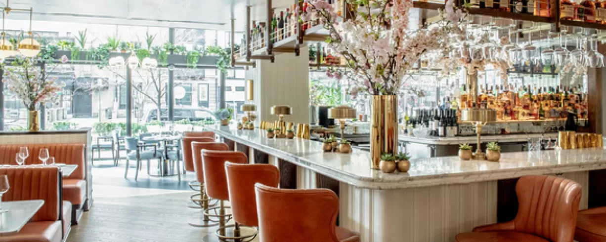Designed by world-renowned Martin Brudnizki, The Pembroke is complemented by a pretty and seasonal outdoor terrace and features an edifying blend of cream-paneled walls adorned with playful artwork, plush velvet plush banquettes in a mix of blue and coral tones and beautiful marble tabletops. At its center is the beautifully- appointed marble bar, a classic cocktail bar reminiscent of the 1950s, serving a range of spirits and the finest wines. Lunch, brunch and dinner menus, reflect the best organic product sourced from local farms and purveyors. Delicious global influences abound.