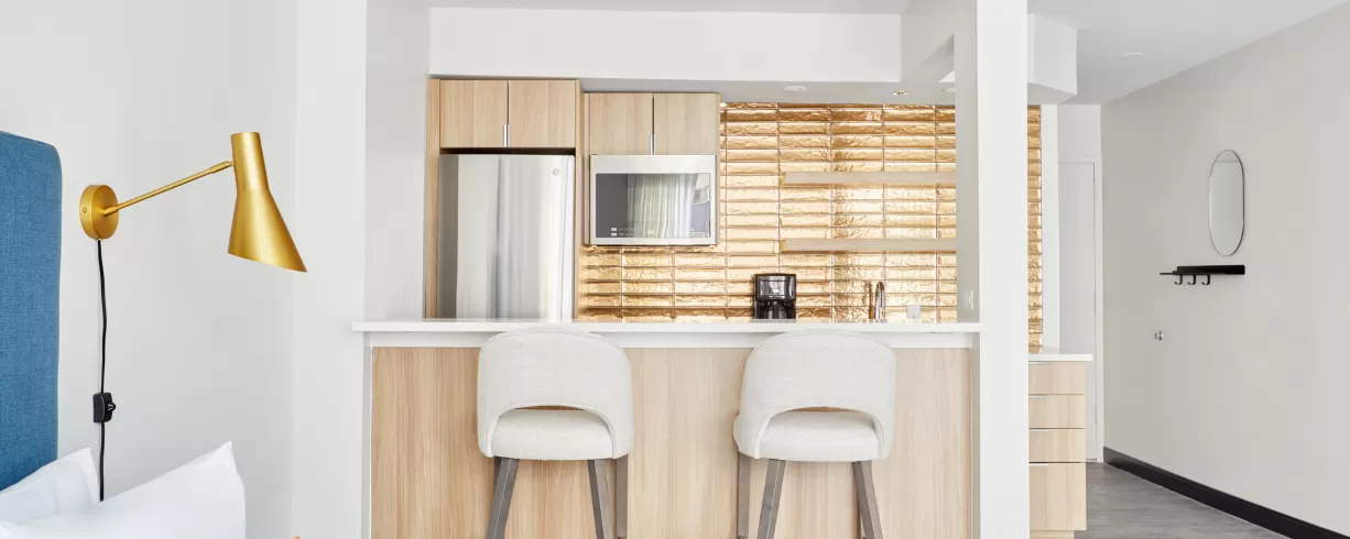 Our spacious guest rooms are your personal oasis, designed with your comfort in mind. Indulge in plush bedding, sleek furnishings and city views. Unwind in style with our exclusive amenities, including full kitchens, state-of-the-art fitness studio, daily morning coffee, smart TVs, valet parking and a meeting room that accommodates 30. Explore the city's iconic landmarks, world-class museums, and thriving arts scene with ease.
