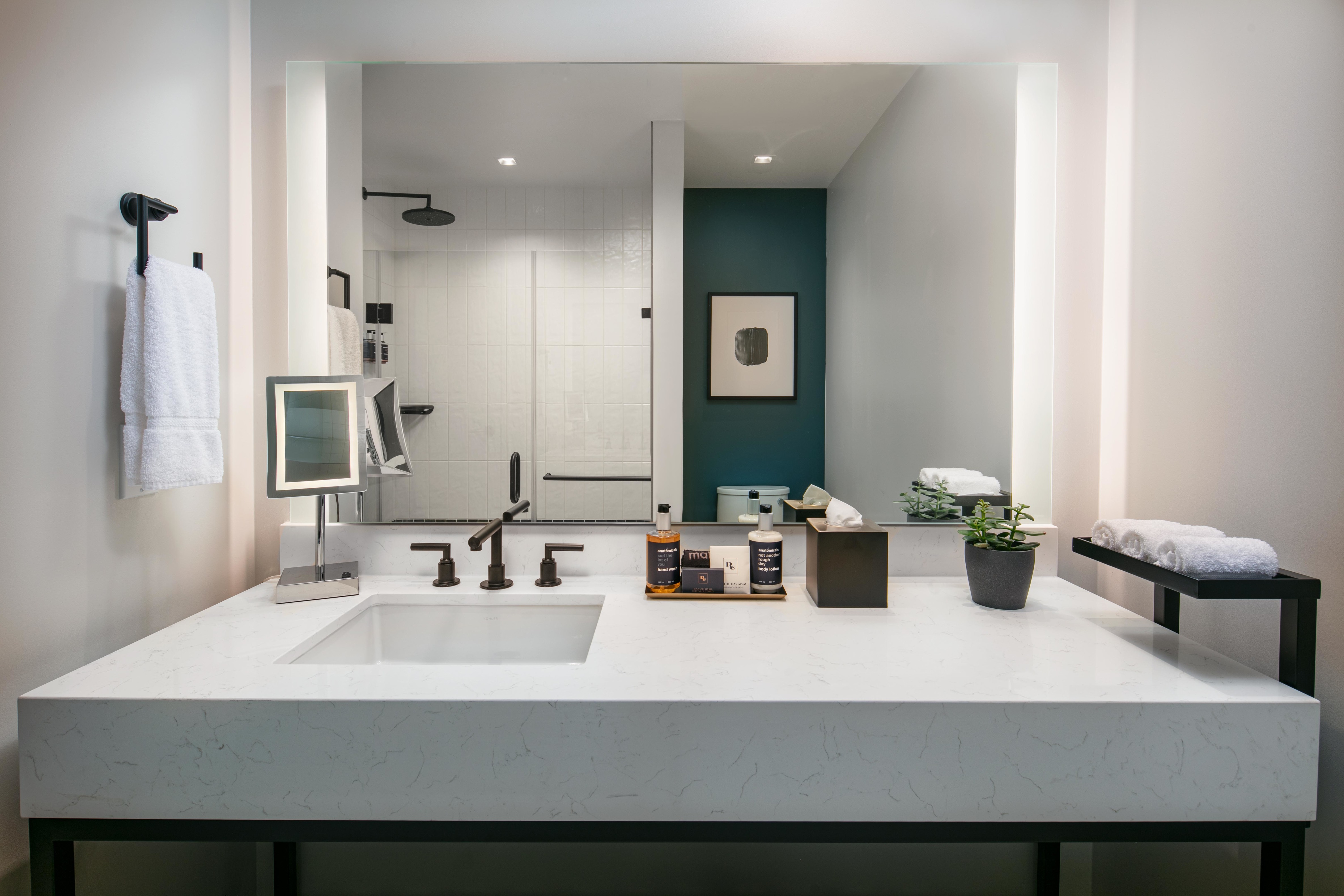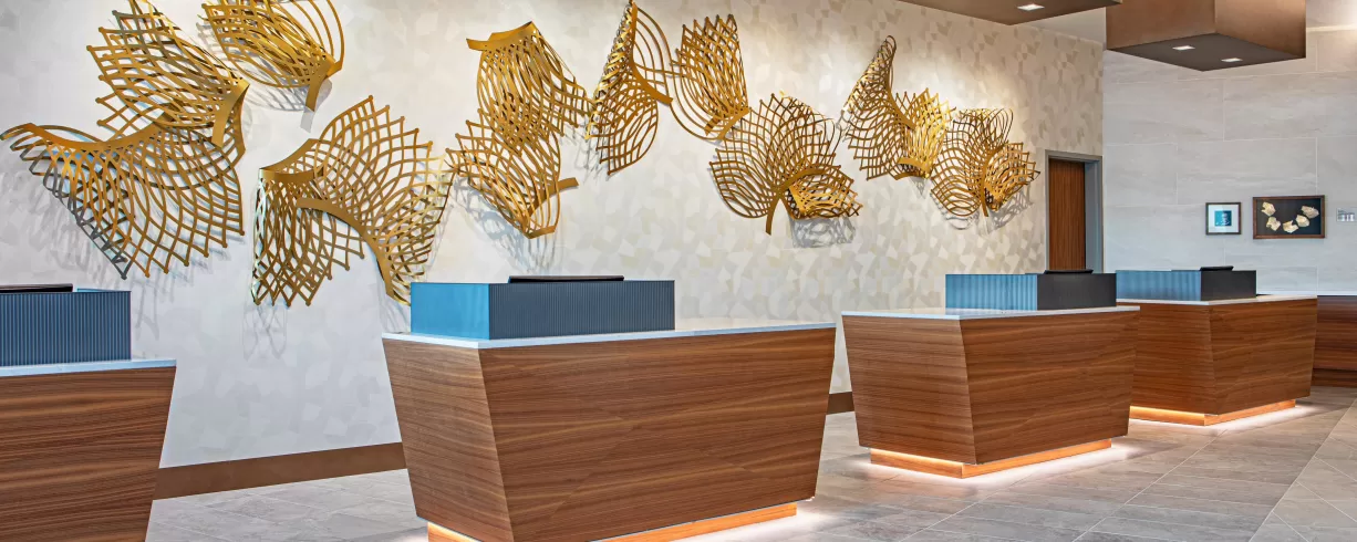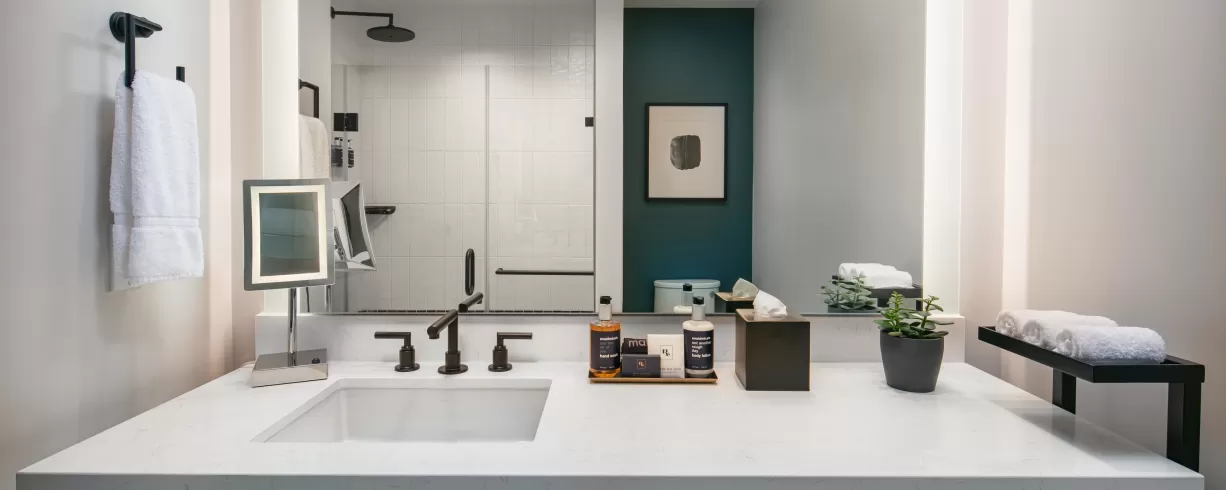 A cleansing palette of neutrals with artistic accents sets a calming tone in our lobby and well-appointed rooms. Our French bistro restaurant promises a sophisticated, savory experience. Embodying the fusion of green, wellness, and tech-forward design, our hotel is LEED Gold Certified with a WELL Certified Core/Shell and boasts an on-site fitness center and yoga studio, EV charging stations and well-equipped networking spaces throughout the property. Our penthouse conference center and ballroom with private terraces offer a breathtaking backdrop, ideal for collaboration or celebration.