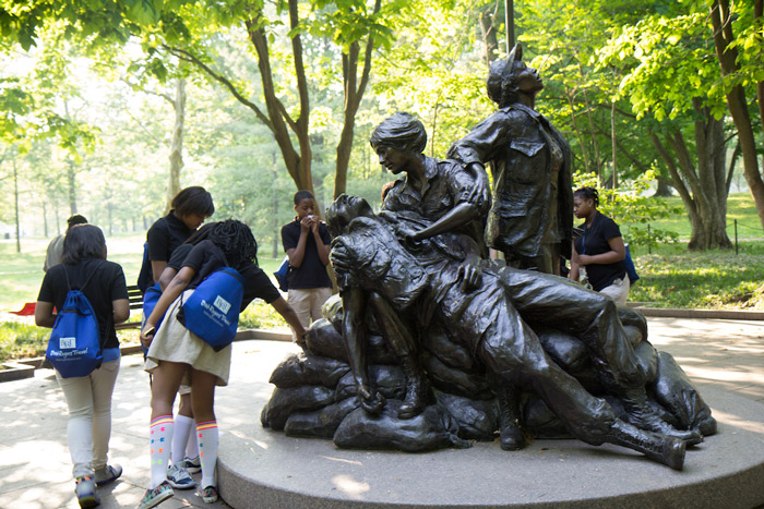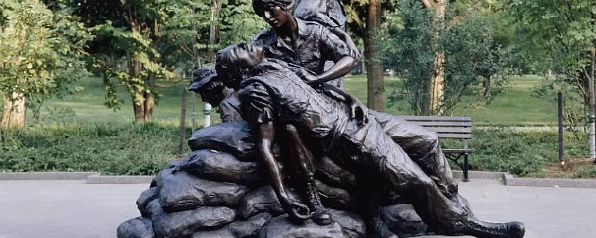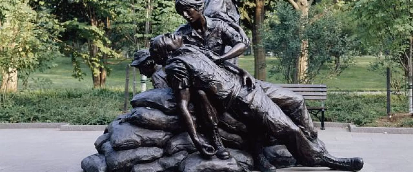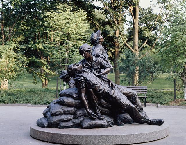 Just south of the Vietnam Veterans Memorial Wall is the Vietnam Women's Memorial, which commemorates the 265,000 military and civilian women that served during the Vietnam War, 11,000 of whom worked as nurses. The 2,000 pound bronze structure stands 15 feet tall and depicts three women attending to a wounded soldier, reflecting the unity required during the conflict.