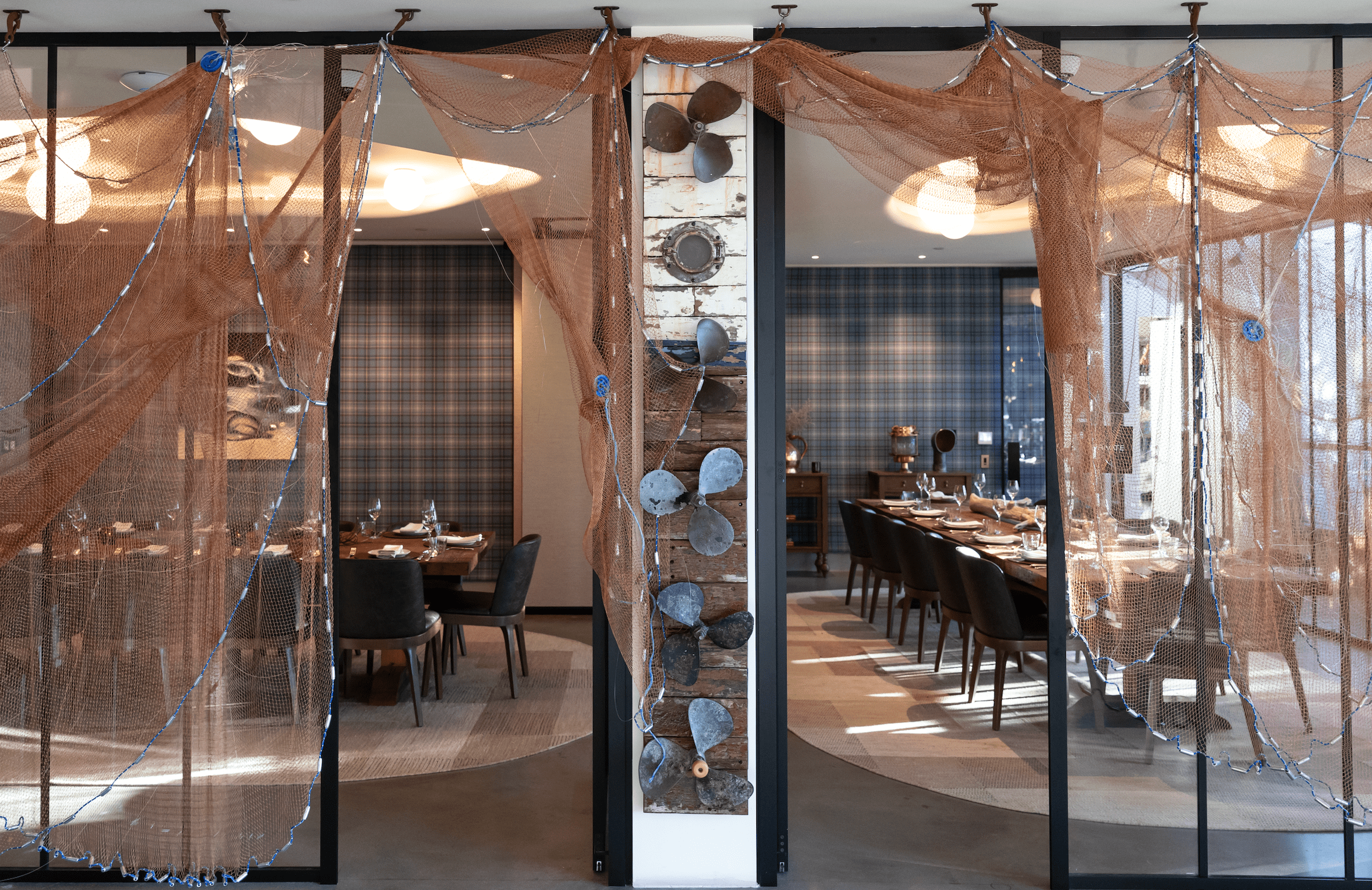 We have three private dining rooms to choose from. The smaller, interconnected Ballater Rooms can be reserved individually (seating 12 guests each) or combined to host up to 26 guests. Featuring glass paneling, repurposed fishing-net curtains, tartan-accented walls, and views of the boats on the Potomac, these rooms bring charm and character to every gathering.