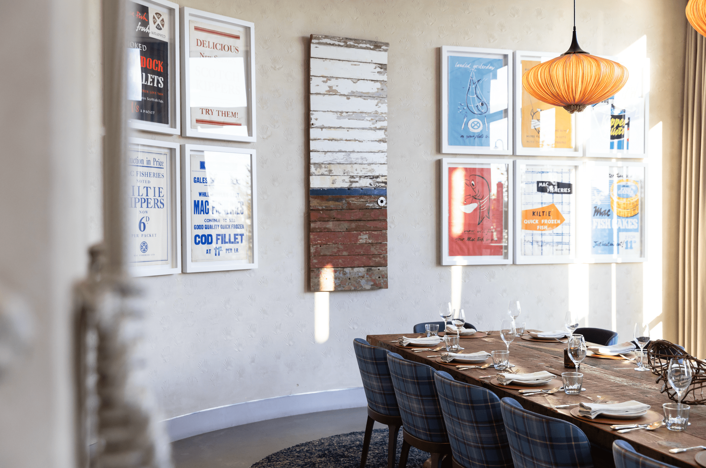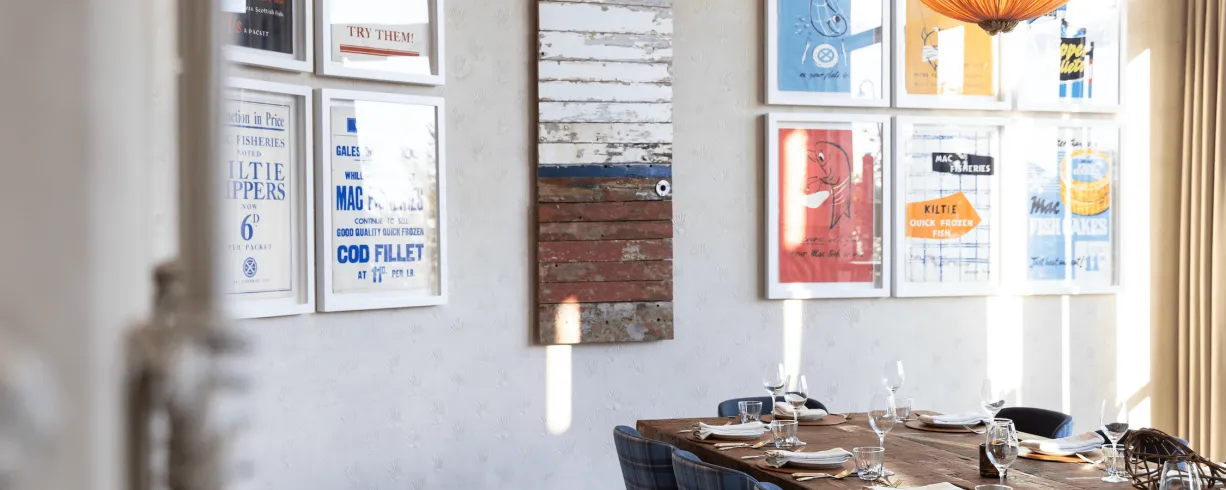 Our principal private dining space, The Boat Room, features a 200-year-old handcrafted timber table built in part from decommissioned ships. Seating up to 26 guests, the room overlooks The Wharf Terrace and is crowned by a striking suspended boat installation. Original Mac Fisheries posters add further depth and storytelling to the setting.