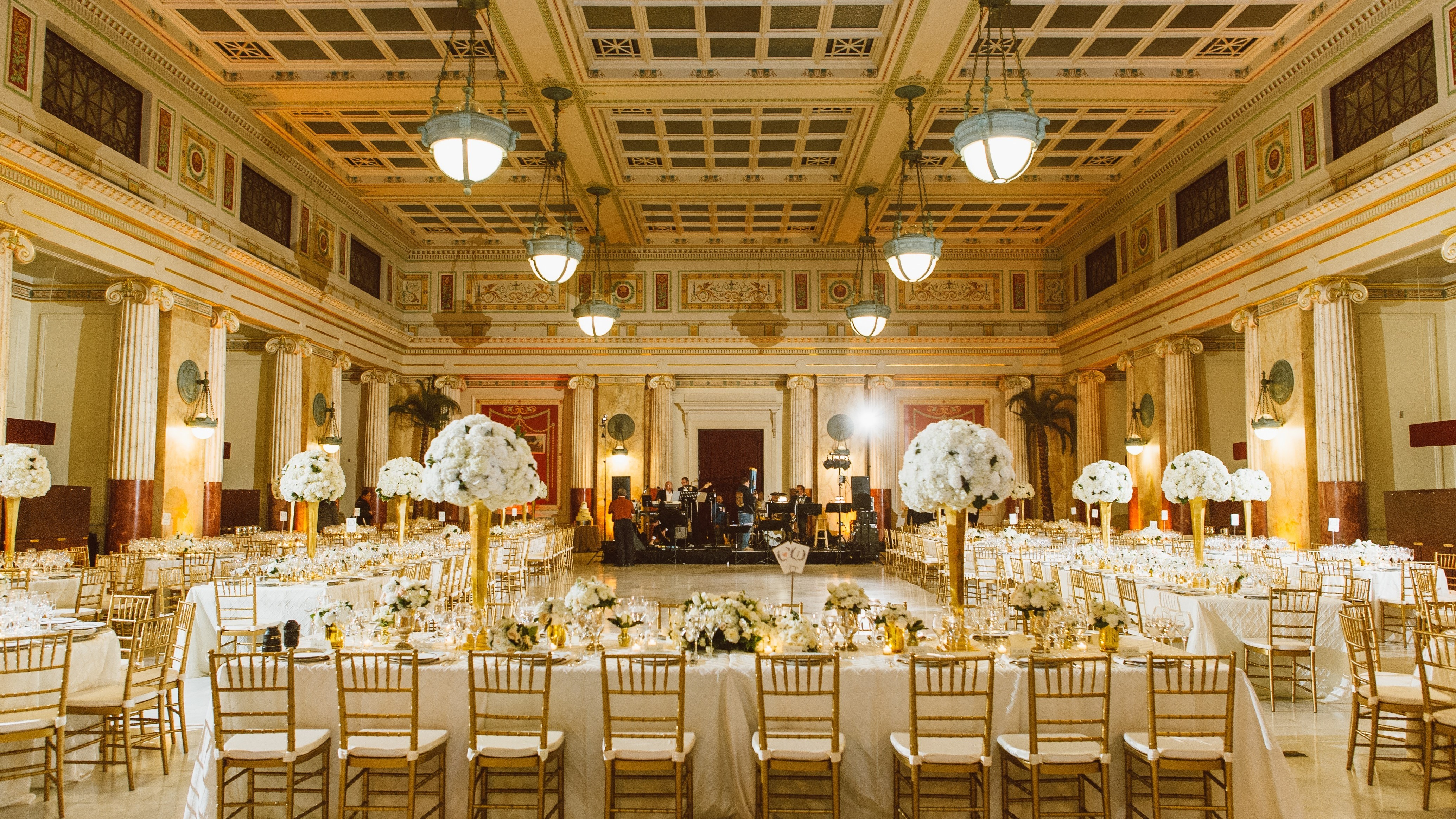 The grand Main Hall and Main Hall-East, modeled after the Baths of Diocletian in Rome, features barrel vaulted ceilings lined with 23-carat gold leaf, distinguished white marble floors, and remarkably oversized windows.
