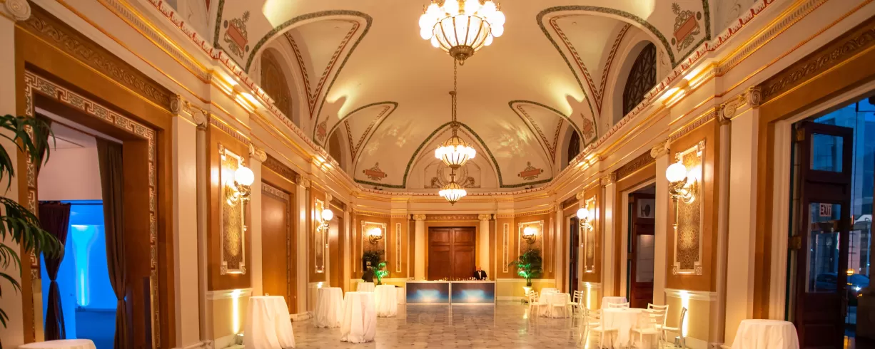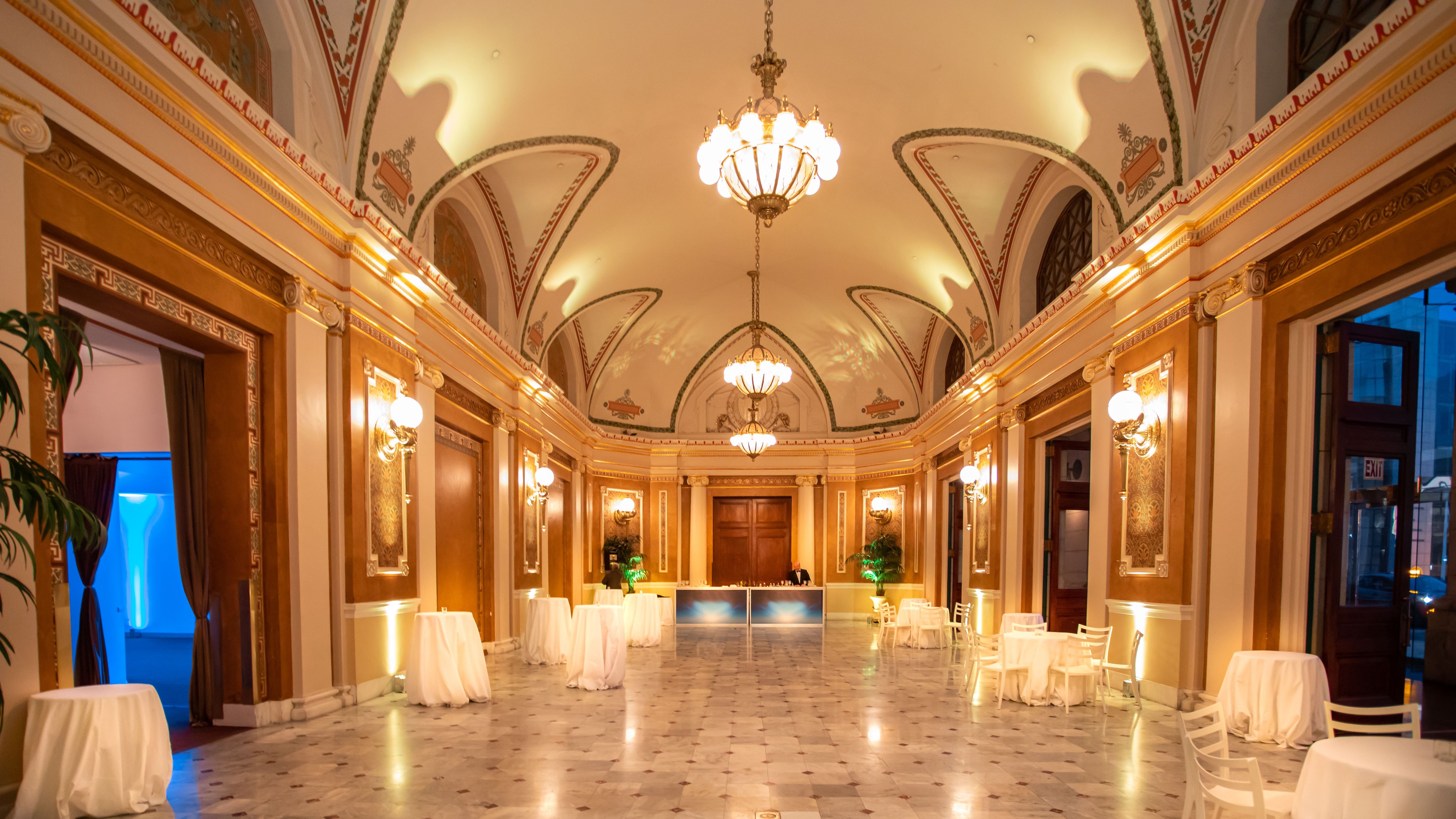 The versatile East Hall boasts a dramatically raised 31’ ceiling, marble floors, glamorous lighting, and alluring architecture.