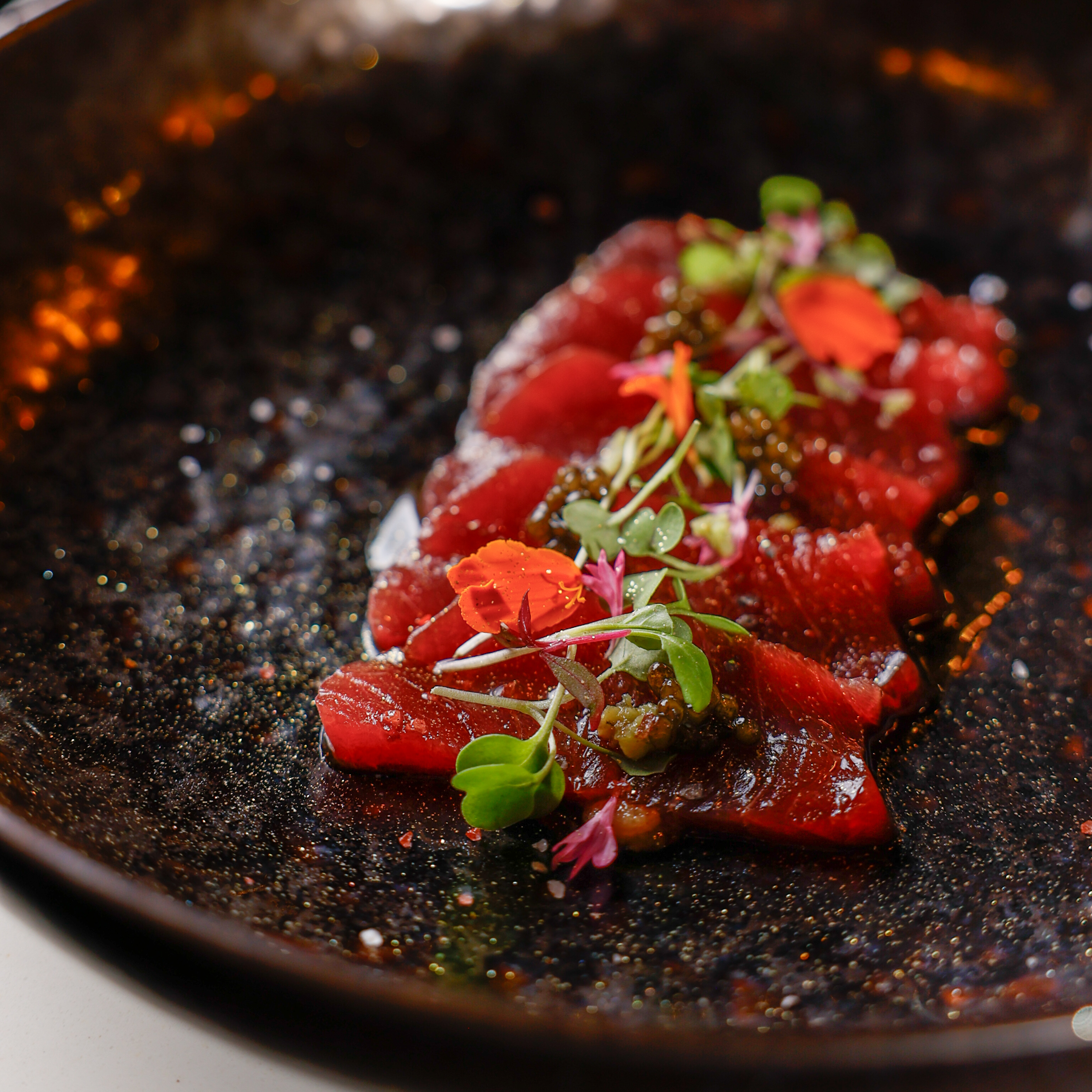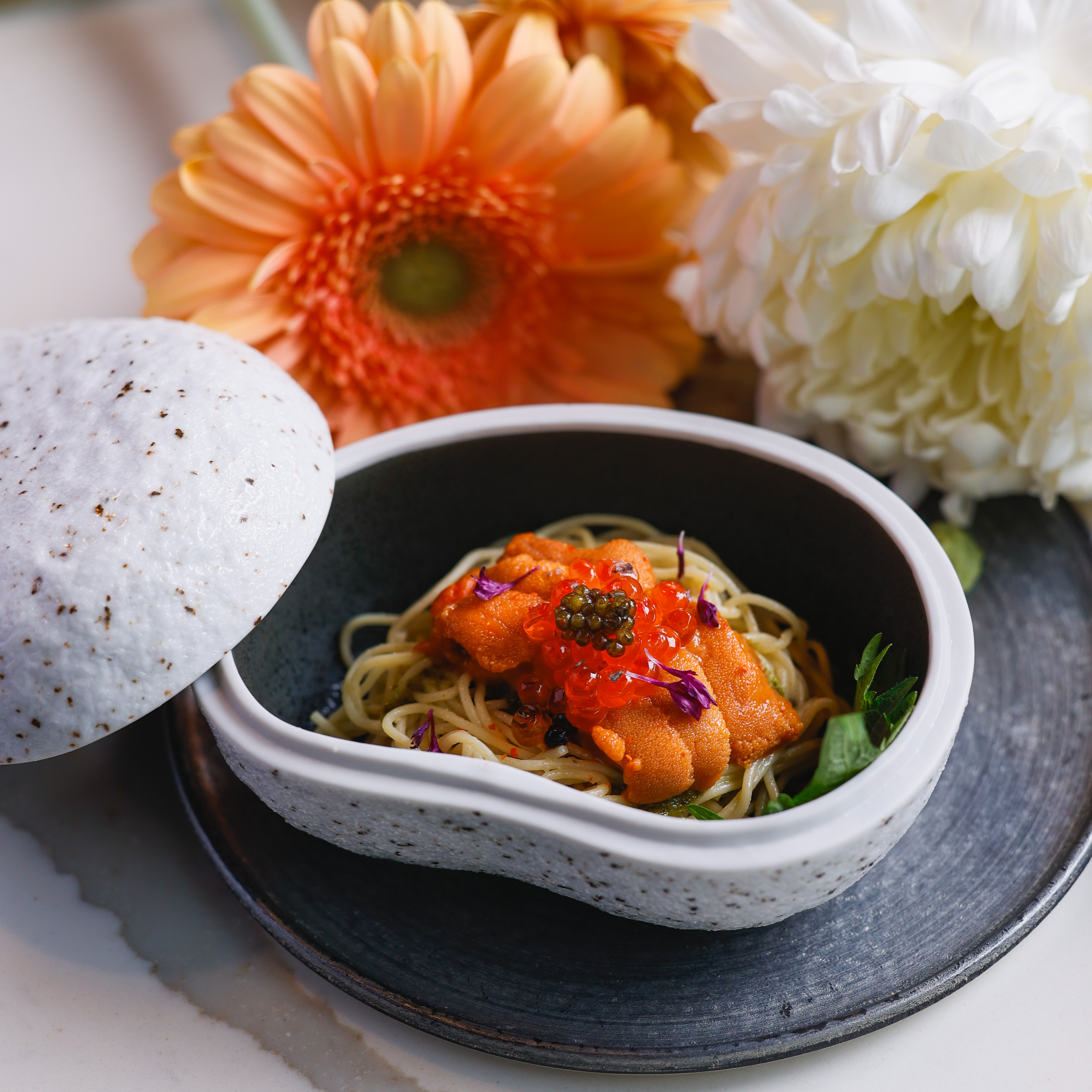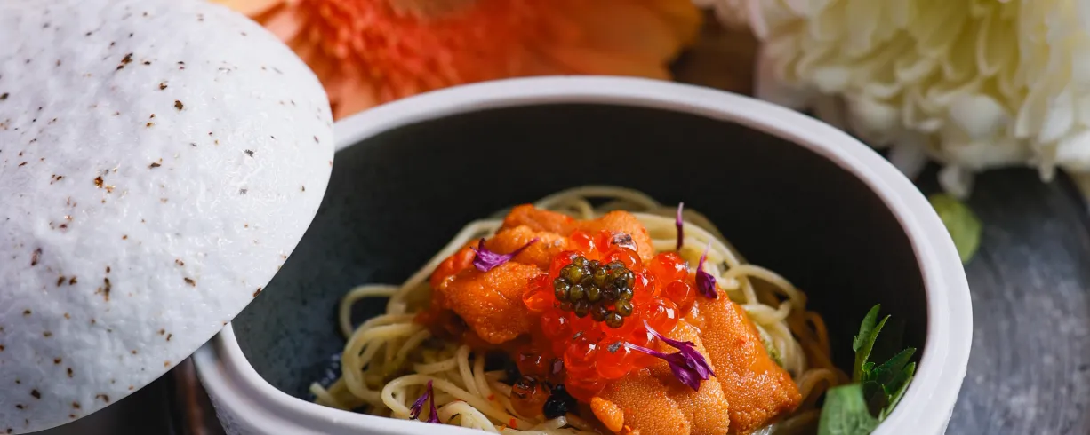 Our space features an expansive 17-seat sushi counter, a six-seat cocktail bar, open table seating, and a seasonal patio that’s perfect for warm-weather gatherings. Hand-painted Japanese murals and graffiti-lined walls create an environment that’s both visually memorable and casually inviting. Led by Culinary Director and Executive Chef Saran “Peter” Kannasute, the menu focuses on premium seasonal ingredients sourced globally, with options for both informal and curated events.